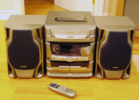 Подивився по компутерних магазинах – ціни на самі прості колонки – космос! Більшість підтримує iPod - ціна 100 баксів. Самі прості колонки-«вонючки» 40-50 баксів. Вирішив подивитися в Інтернеті по об’явах. Вже як брати б/у то хотілося або вже щось серйозне, або якийсь недорогий магнітофон, щоб радіо було і вхід (щоб компутер мож було підключити). Переглянув десь сотню об’яв. Одна зацікавила особливо. В сусідньому «селі» продають мафон за 5 баксів. Написав листа чи має він аналоговий вхід і чи ще продається. Відписав Джон, що ще є. Ввечері як їхав додому, заїхав до Джона і перепитав за ціну. 5 (!!!) баксів. Не вірив. Він робить? Він давай показувати що все працює і який хороший звук… ))) Лиш нема батарейок до дистанційки і коли переключає між дисками (їх мож 5(!) в нього запихнути) то видає характерний шум) )))